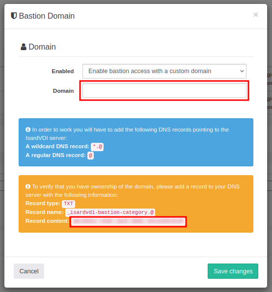 Enable bastion access with a custom domain: This option allows you to configure a custom domain for Bastion access to the virtual desktops in that category. To do this, you’ll need to add some records to your DNS server.