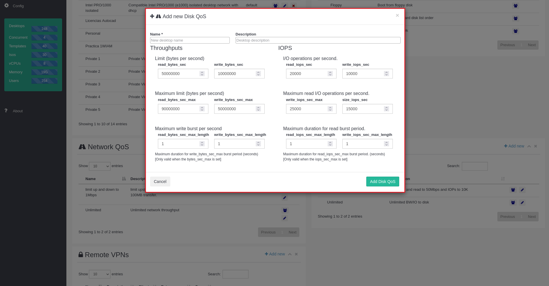 In this section you can add private networks to desktops.