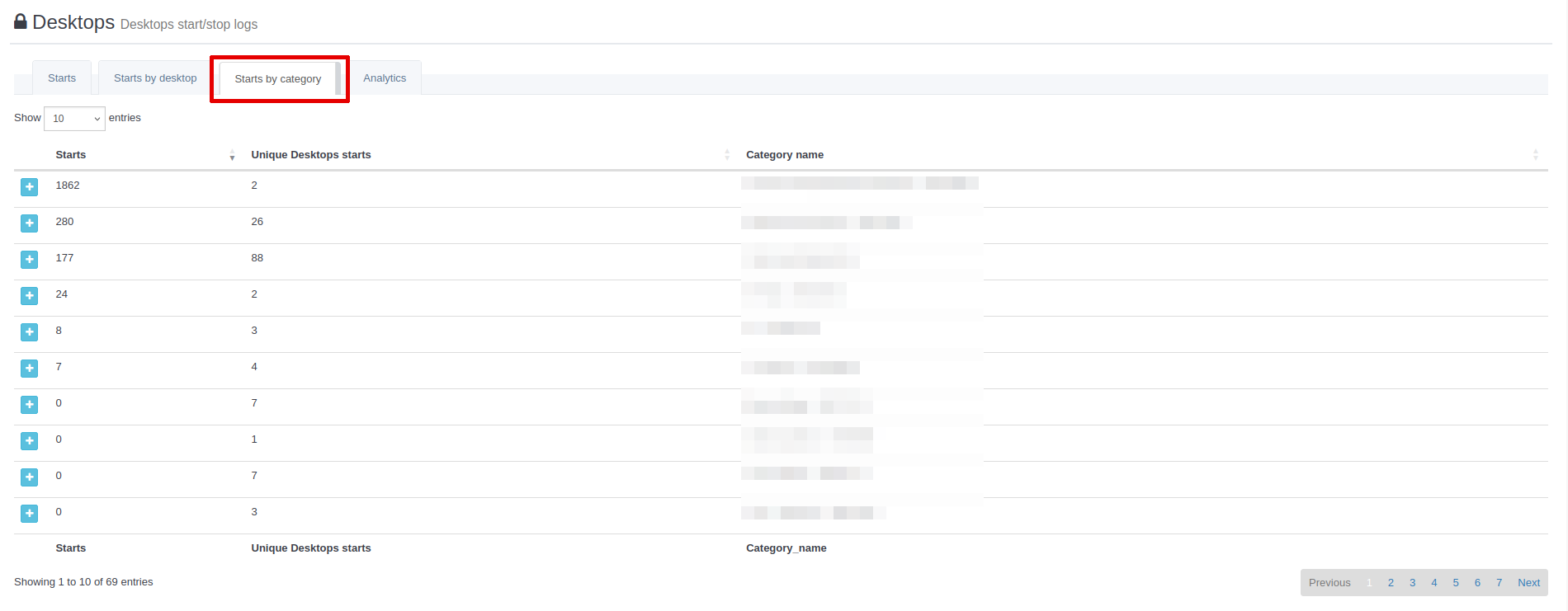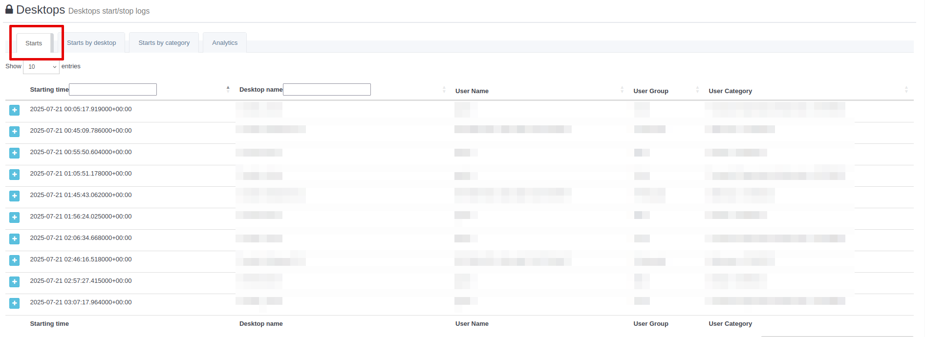 This view displays starts grouped by desktop. If your platform has many desktops, it may affect page load time, especially depending on the selected time range.