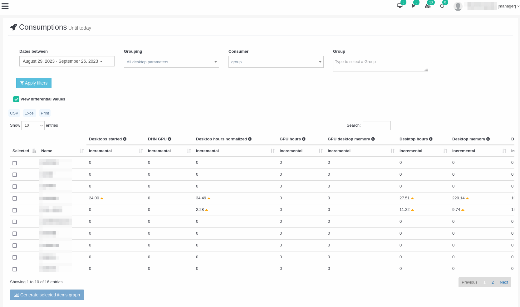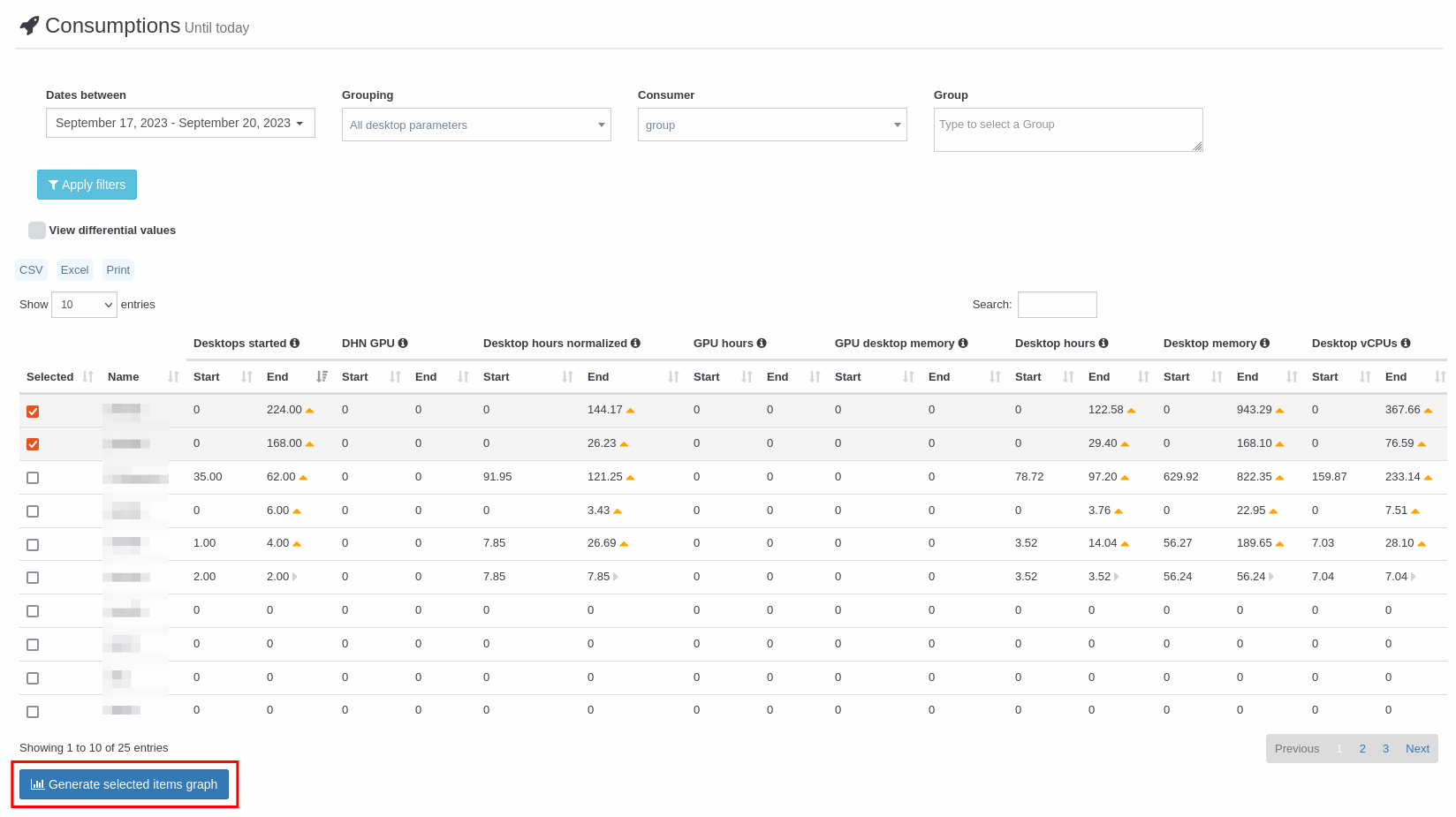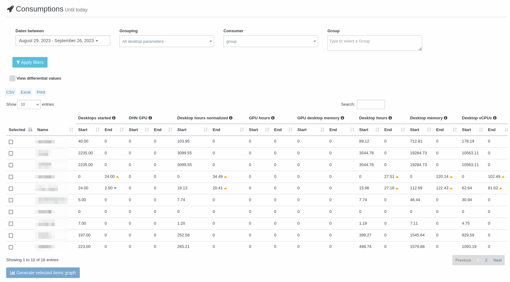 - For a desktop we can see the consumption by category, group, deployment, template, user and individually for each desktop.