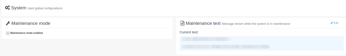 L'administrador del sistema pot crear un arxiu anomenat /opt/isard/config/maintenance per a canviar al mode de manteniment a l'inici. L'arxiu s'elimina una vegada que el sistema canvia al mode de manteniment.