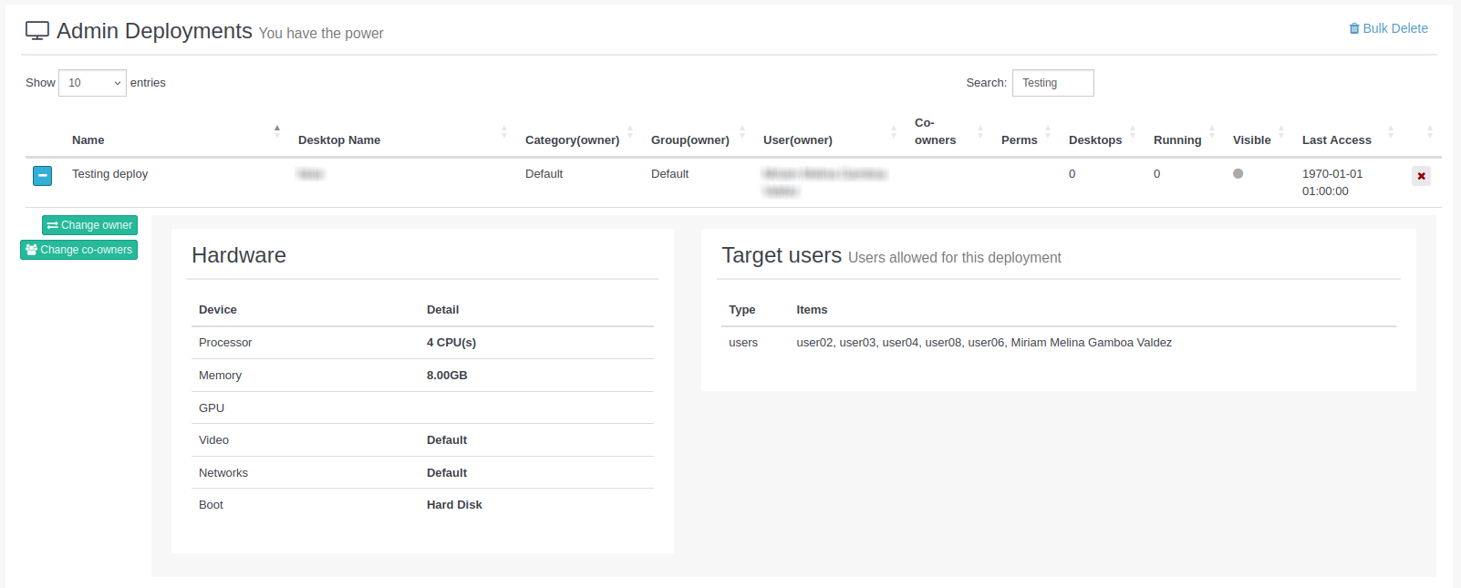 Tot i que el desplegament es comparteix amb diversos propietaris, només el propietari principal podrà canviar de propietari, afegir-ne de nous o esborrar el desplegament. La informació del propietari principal continuarà apareixent a la columna Owner, i els co-propietaris es mostraran a la columna Co-owners.