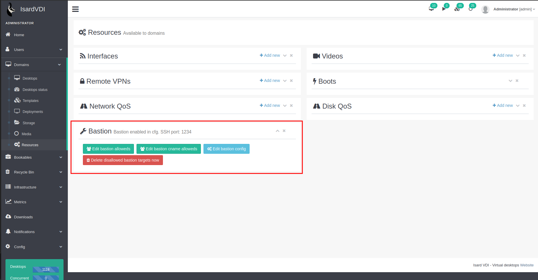 Interfície d’administració: Un cop aplicats els canvis, dins l’apartat d’administració, a domains → resources, apareixerà un nou bloc de configuració relacionat amb el bastió.