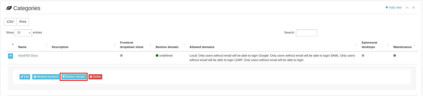 El domini per defecte es pot canviar per un de personalitzat per a cada categoria. A l’apartat de categories es pot veure una columna amb un cercle que es posa verd si Bastió està activat per a aquella categoria: