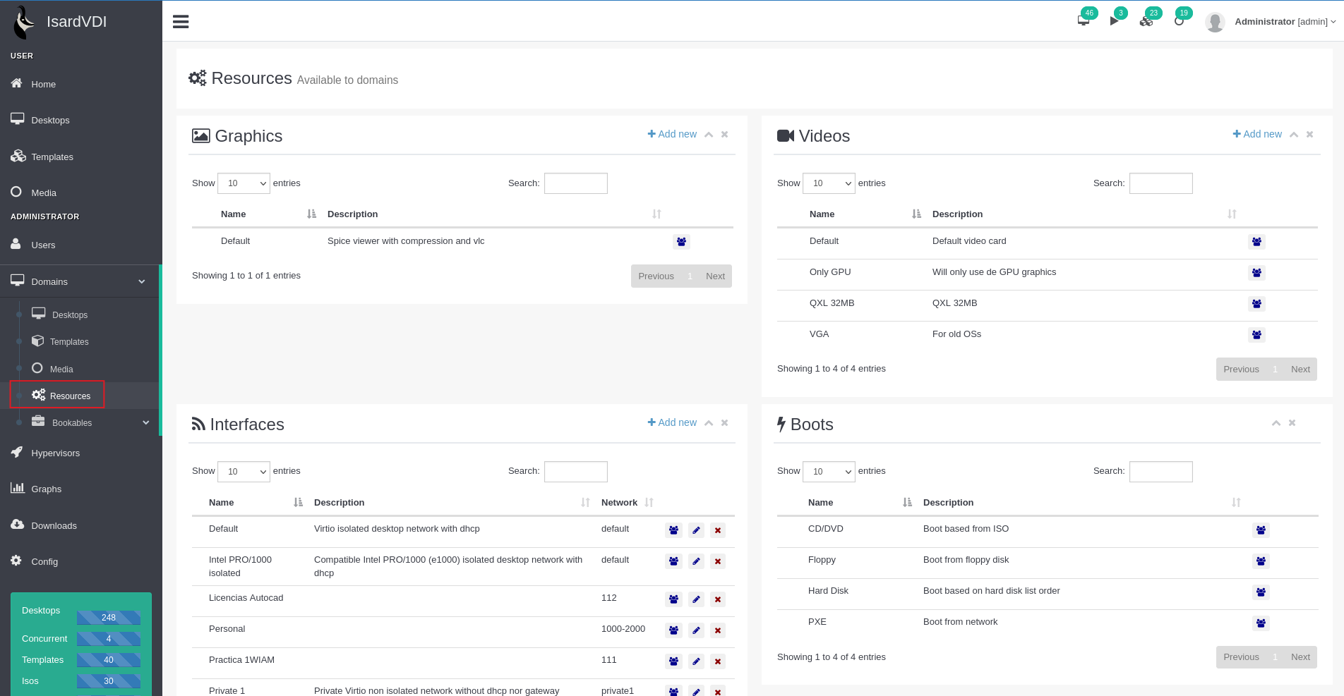 En aquesta secció es poden veure tots els recursos que té la instal·lació, aquests sortiran en crear un escriptori/plantilla.