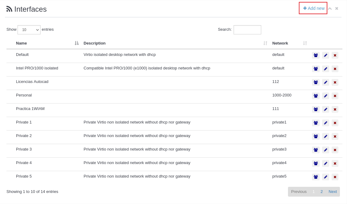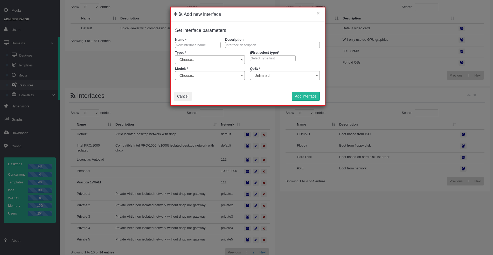 - Bridge: Enllaça amb un pont cap a una xarxa del servidor. En el servidor es pot tenir interfícies que enllacin per exemple amb vlans cap a un troncal de la teva xarxa, i es pot mapear aquestes interfícies en isard i connectar-les als escriptoris.
