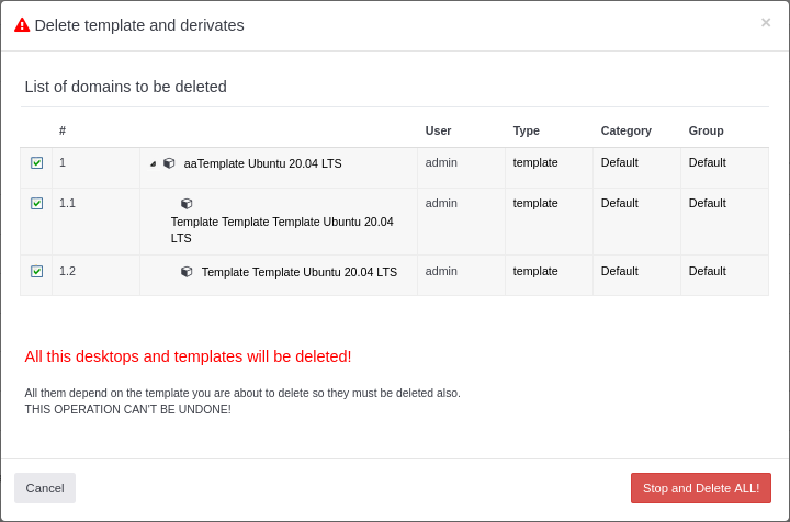 En eliminar una plantilla, apareixerà un modal que mostrarà tots els escriptoris creats a partir d'ella i qualsevol plantilla duplicada. Eliminar la plantilla comportarà l'eliminació de tots els dominis associats i els seus discs.