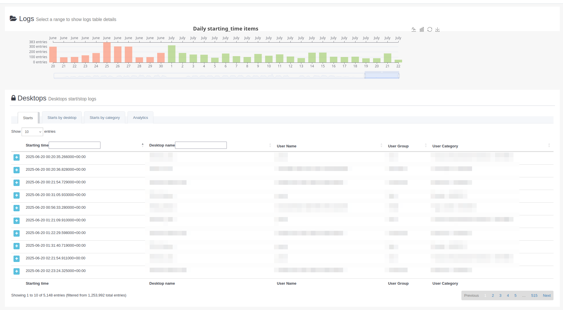 On trobarem dues seccions. La superior ens mostra una gràfica dels logs dels escriptoris. A la secció inferior es mostraran els logs en més detall.