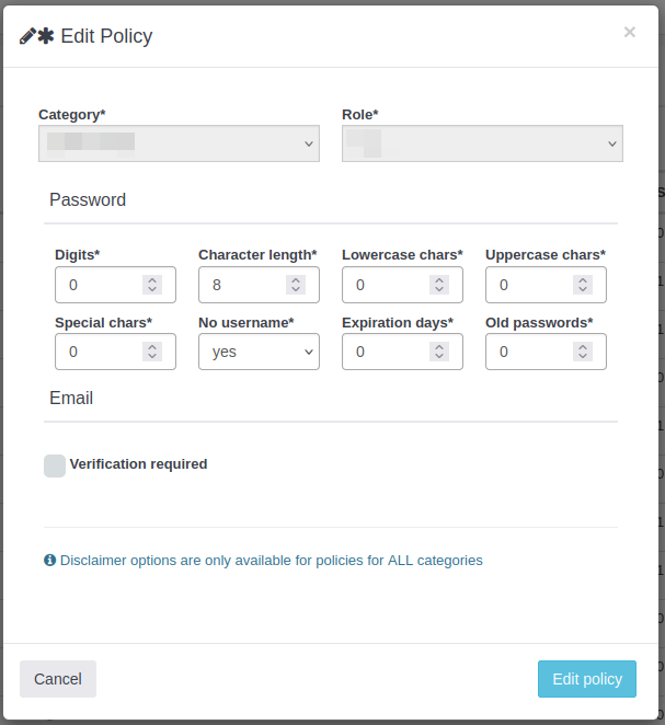 Per poder modificar l'opció del disclaimer, es necessari estar editant una política per totes les categories (All).
