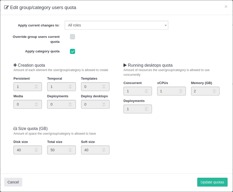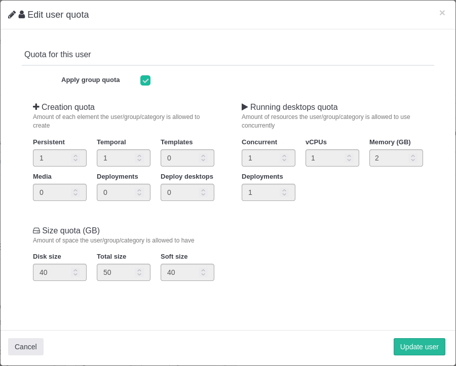 Quota d'Usuari: - Escriptoris persistents: 2 - Escriptoris temporals: 1 - Concurrents: 1 - vCPUs: 4 - Memòria: 8 GB - Plantilles: 1 - Mitjans: 1 - Mida total: 50 GB - Mida soft: 40 GB