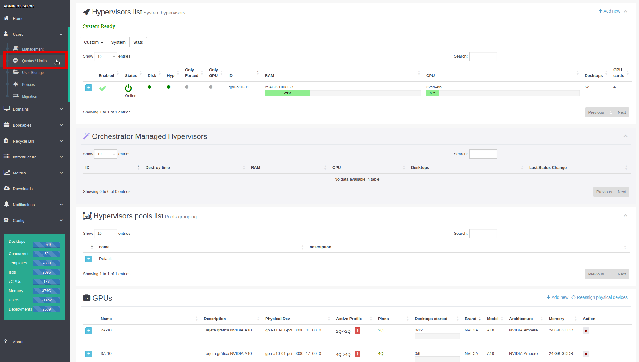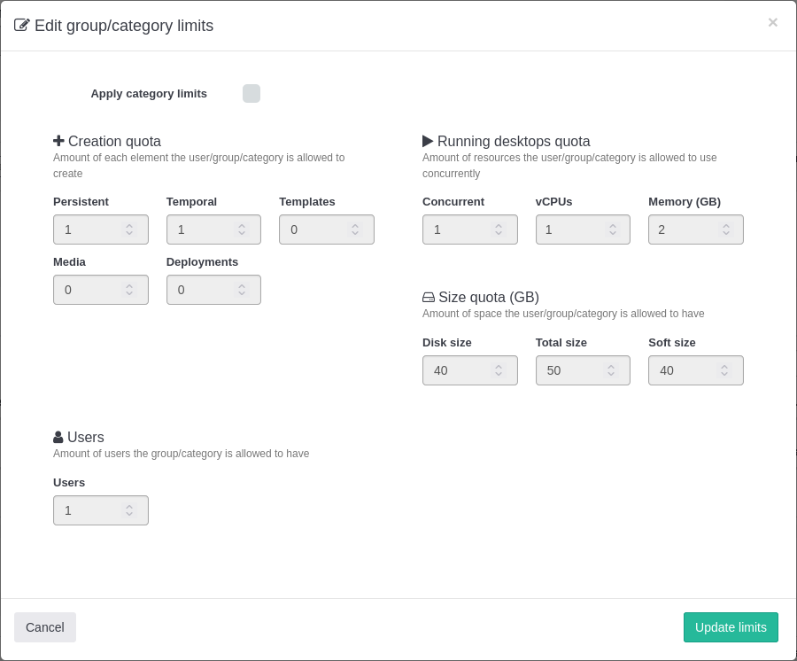 Quota d'Usuari: - Escriptoris persistents: 3 - Escriptoris temporals: 2 - Concurrents: 2 - vCPUs: 8 - Memòria: 16 GB - Plantilles: 2 - Mitjans: 2 - Mida total: 100 GB - Mida soft: 80 GB