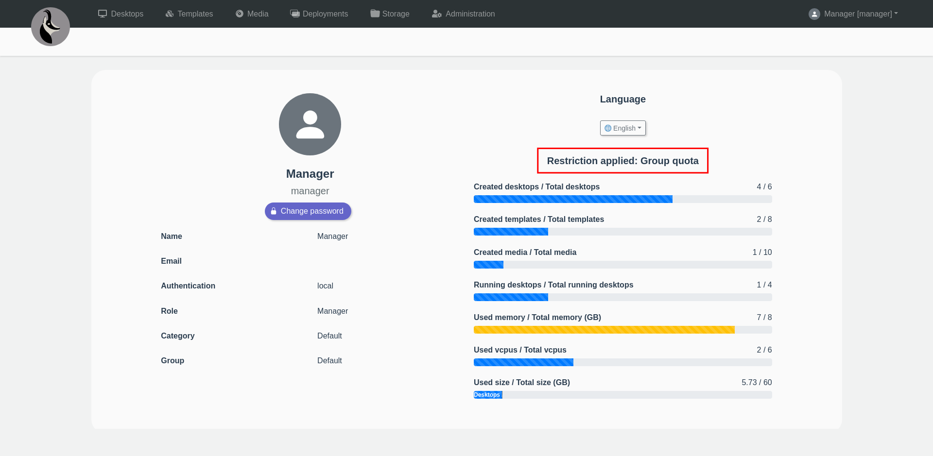 La restricció aplicada (quota d'usuari, grup o de categoria) i l'ús dels recursos es poden consultar a través de la pàgina de perfil.