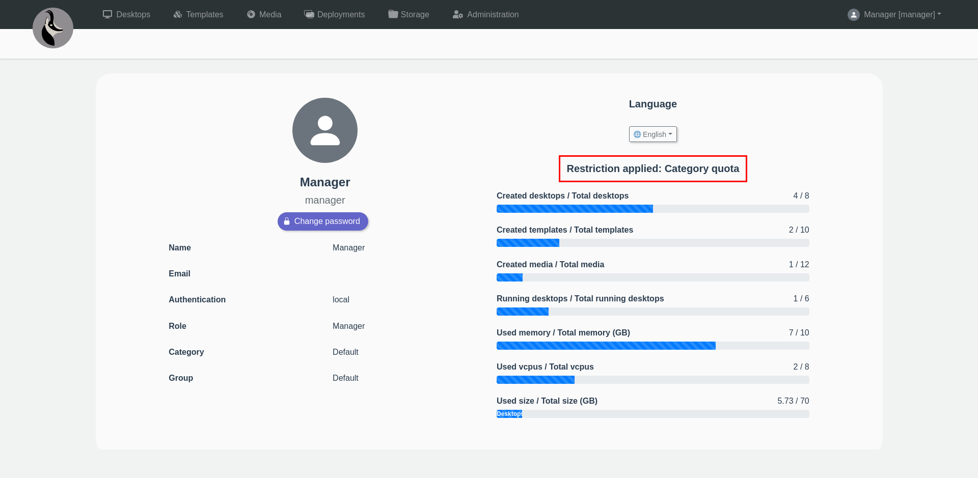 Quota d'Usuari: - Escriptoris persistents: 1 - Escriptoris temporals: 0 - Concurrents: 1 - vCPUs: 2 - Memòria: 4 GB - Plantilles: 0 - Mitjans: 0 - Mida total: 30 GB - Mida soft: 25 GB