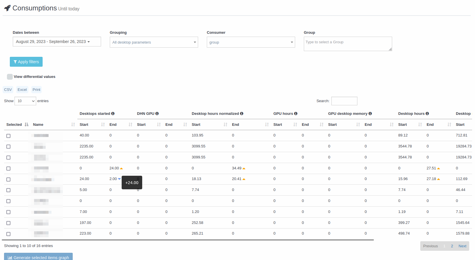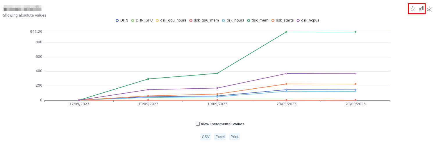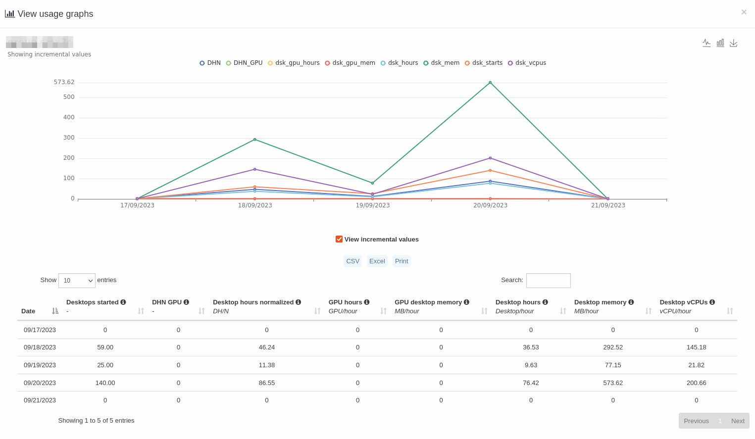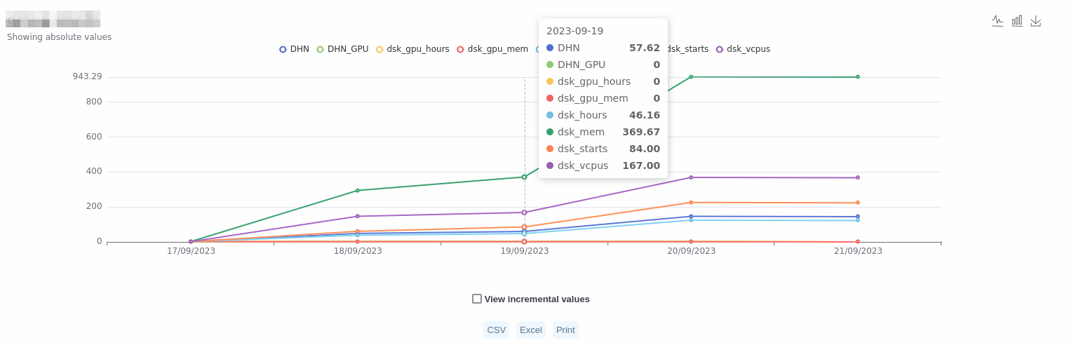 Parameter: Cadascun dels diferents consums registrats. Per exemple quants escriptoris han arrencat, quantes hores han estat arrencats, quanta memòria han fet servir, quant emmagatzematge s'ha fet servir, etc.