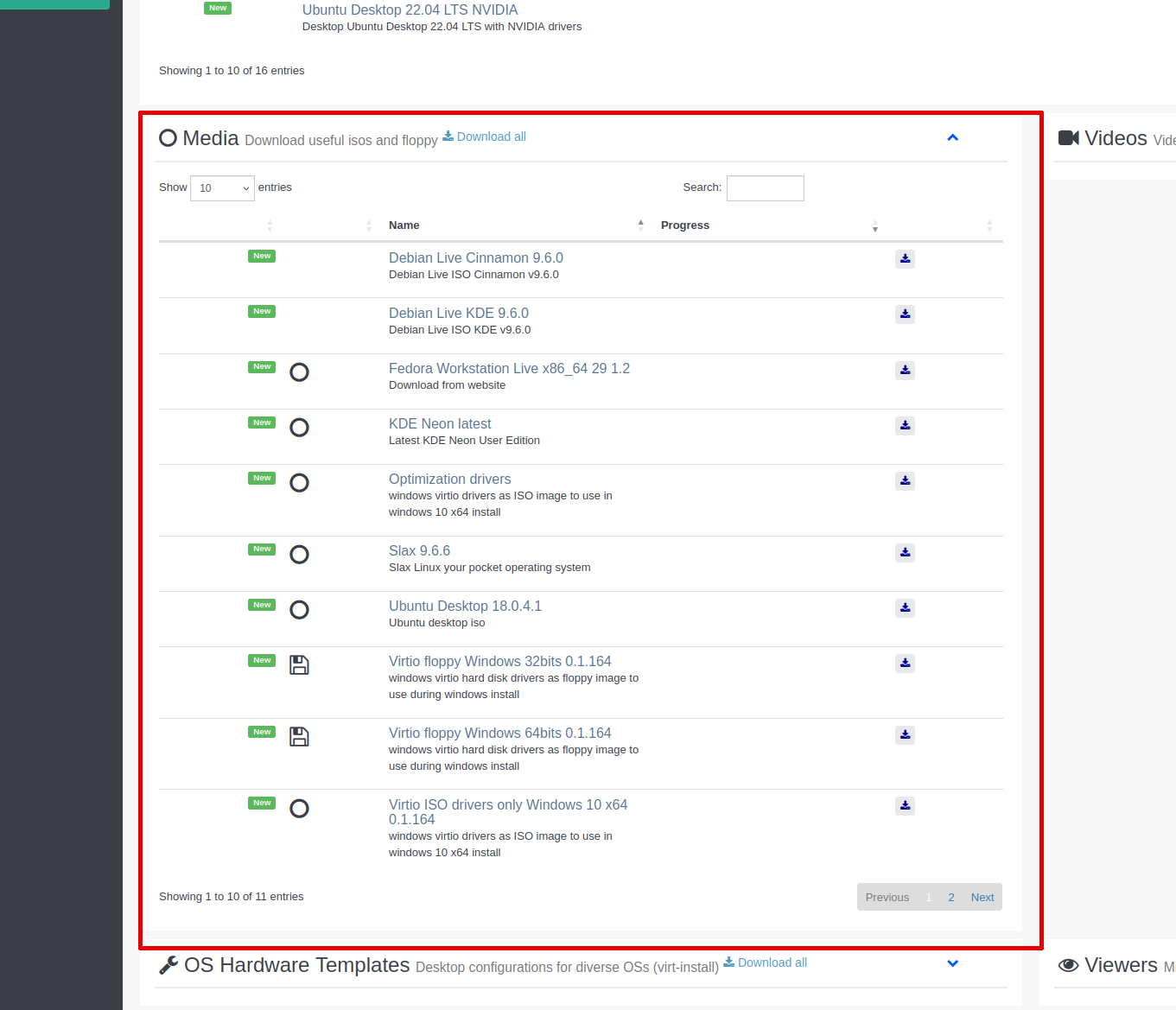 - Des del menú Pujades descarrega l'ISO de virtio win i espera fins que acabi. Aquest ISO especial té controladors Virtio i gràfics QXL per Win.