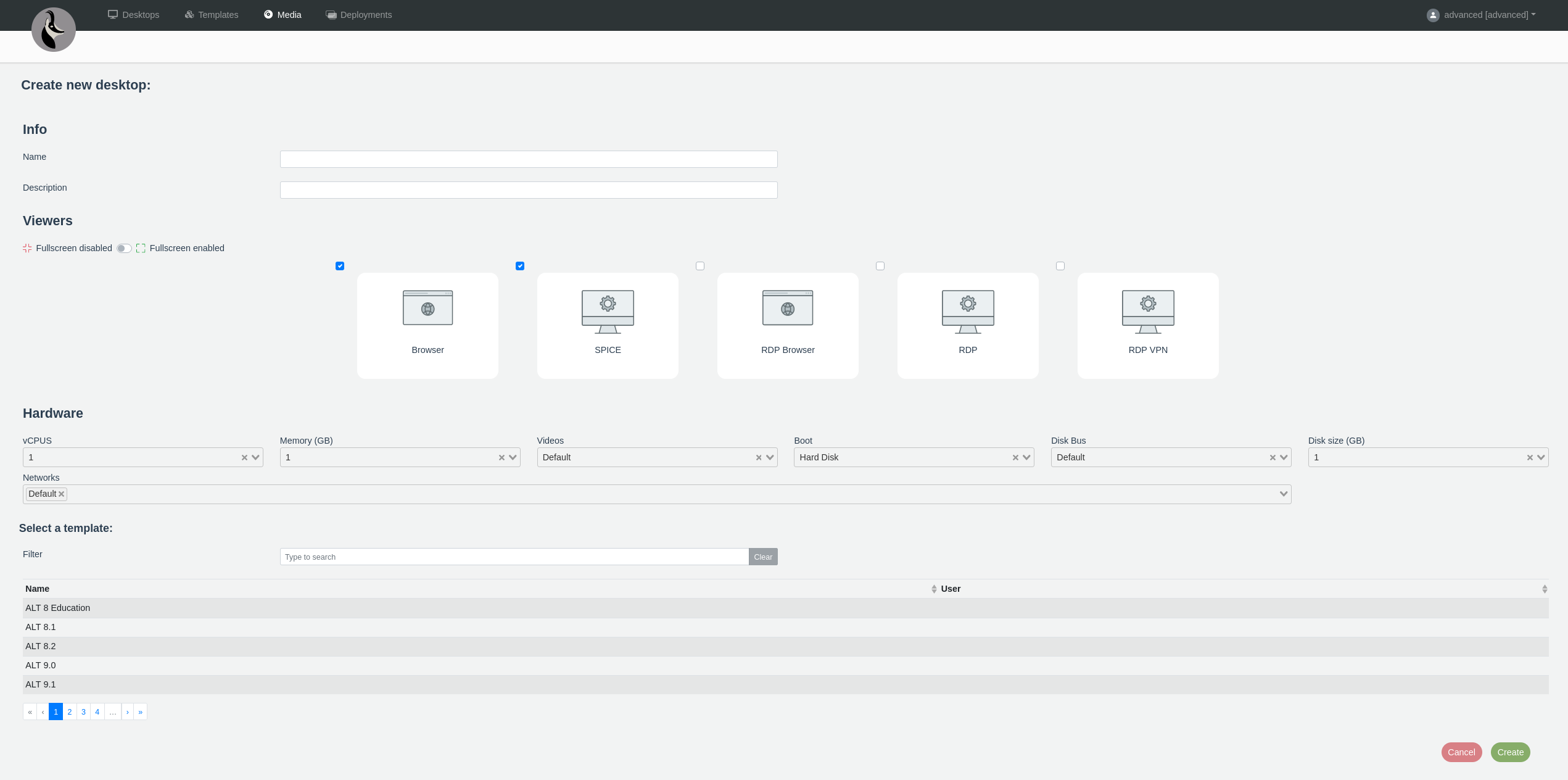 Els Administradors i Usuaris Avançats poden crear els seus propis escriptoris pujant un arxiu ISO d'instal·lació al menú Media.