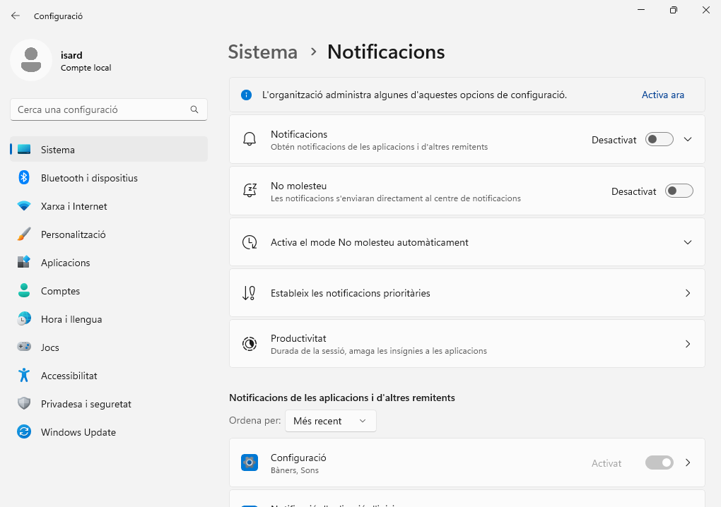 Es desactiven les notificacions de Windows en Configuració → Sistema → Notificacions i accions