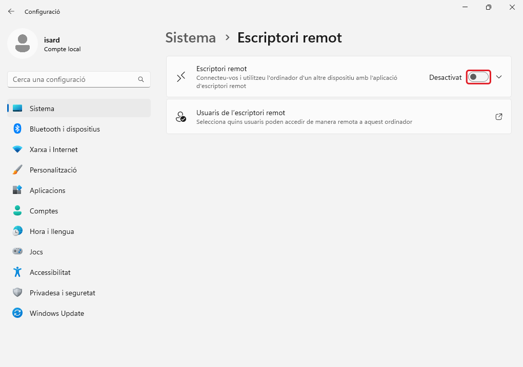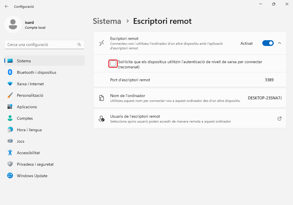 S'habiliten les connexions per Escriptori Remot. S'habilita la primera casella, i es deshabilita la segona casella en Configuració avançada