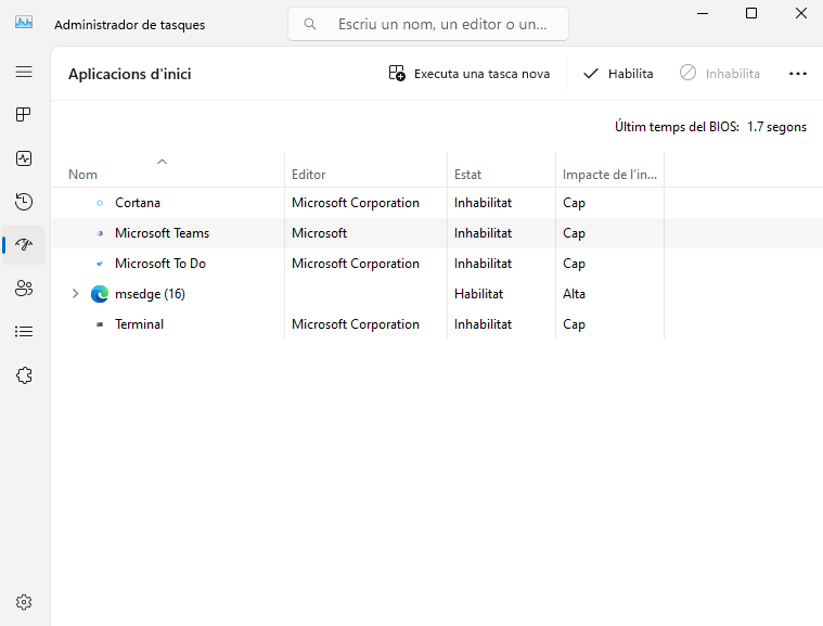 S'obre l'Administrador de tasques i en aplicacions d'inici s'inhabiliten: