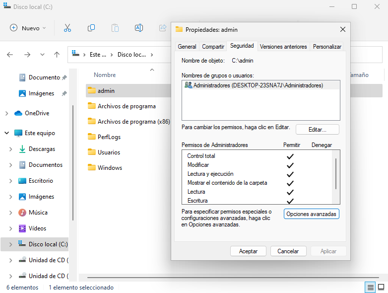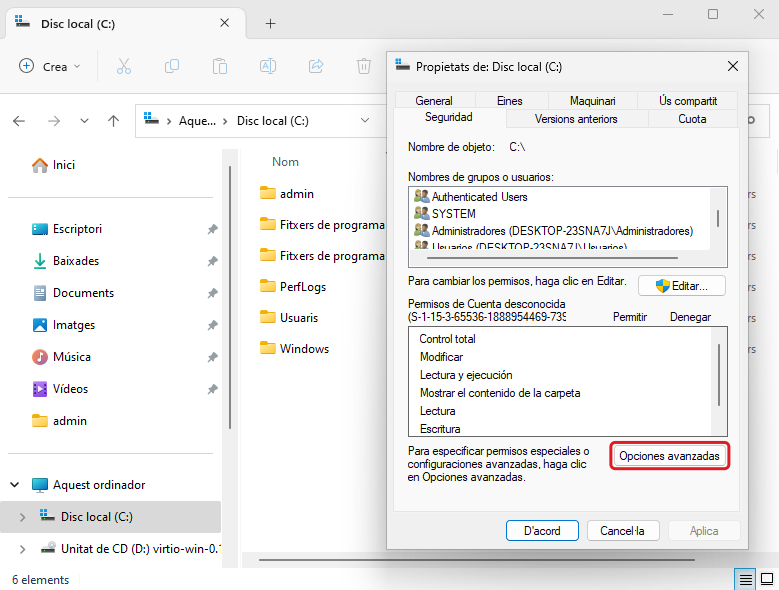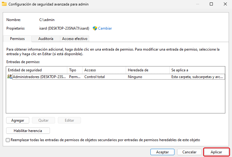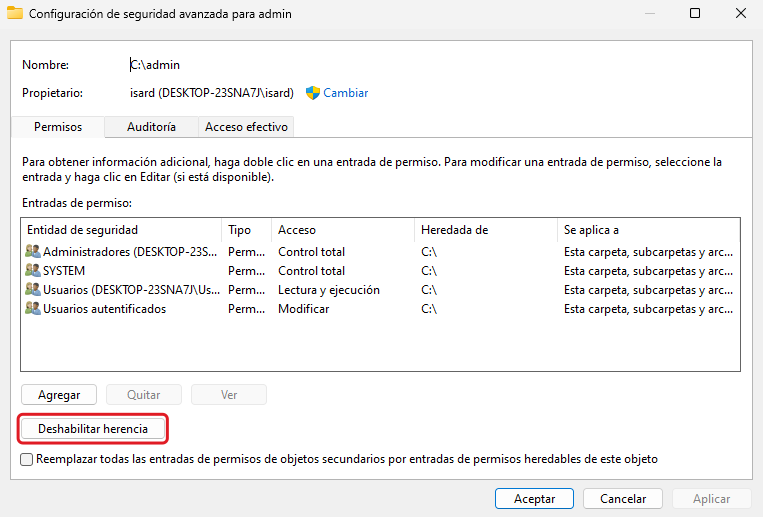 Se li canvien els permisos a la carpeta C:\admin, botó dret en la carpeta i es selecciona "Propietats". S'ha de deshabilitar l'herència de la carpeta i esborrar tots els usuaris que no són Administradors