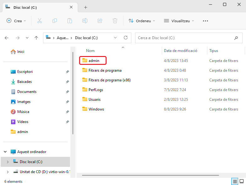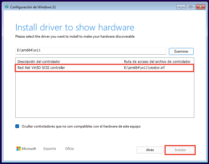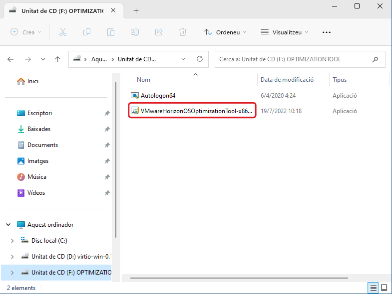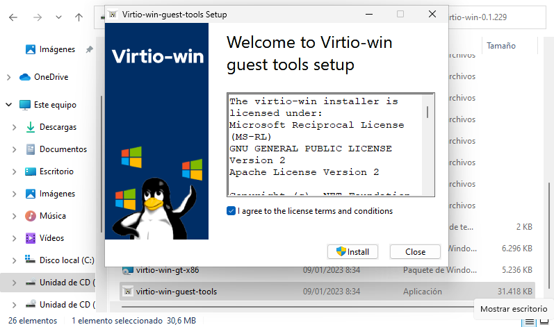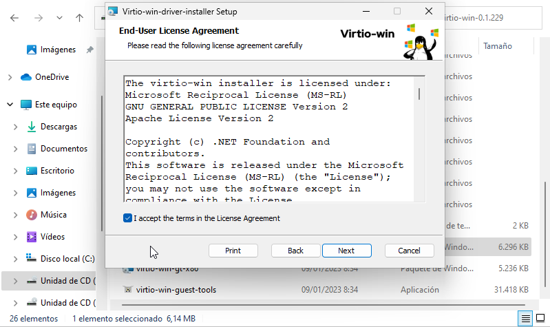 S'instal·len els dos controladors virtio del mitjà de l'escriptori (virtio-win-x).