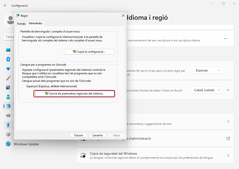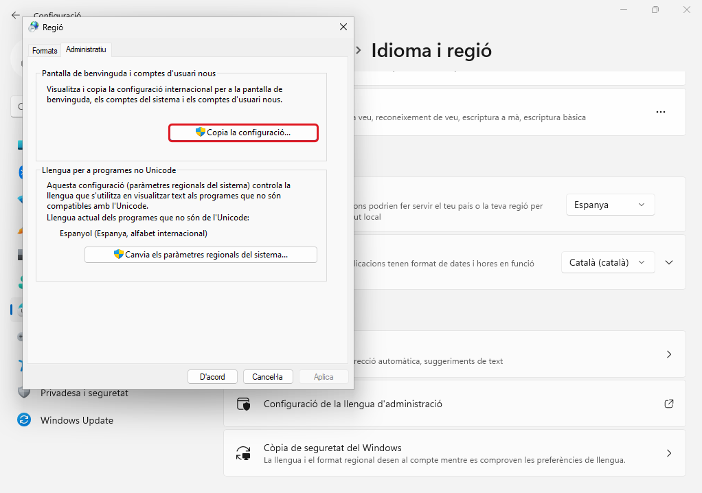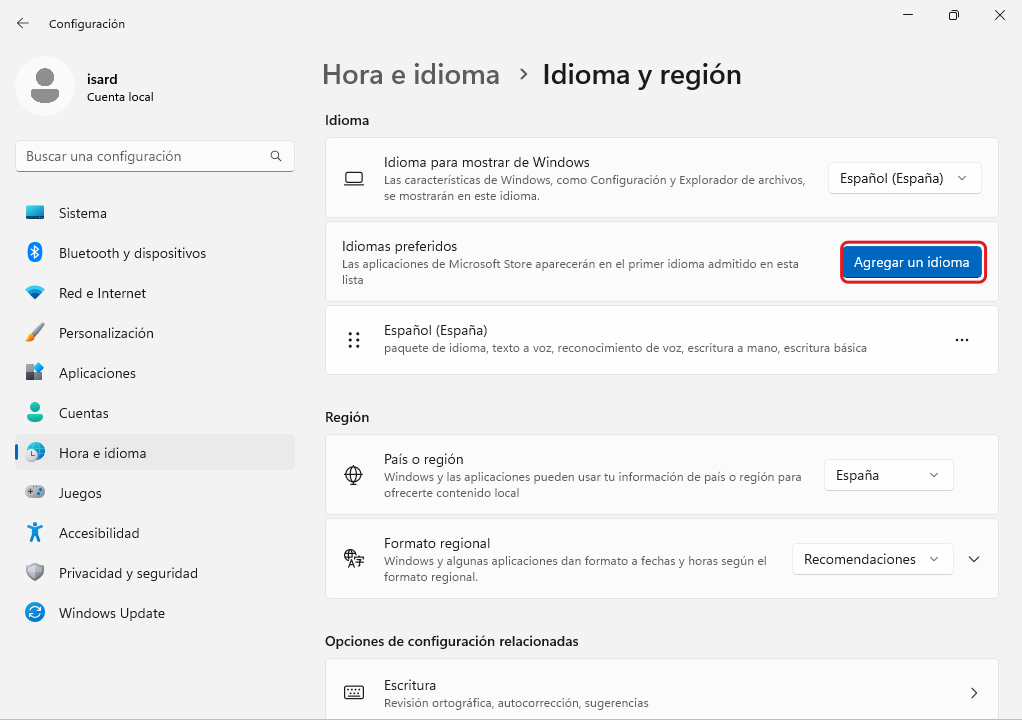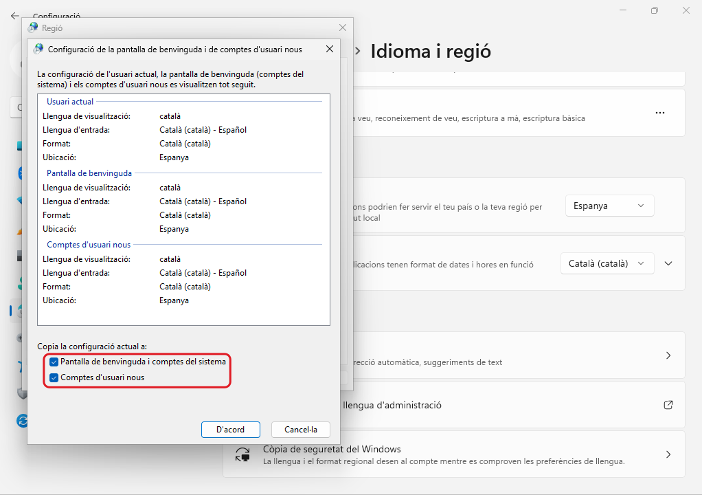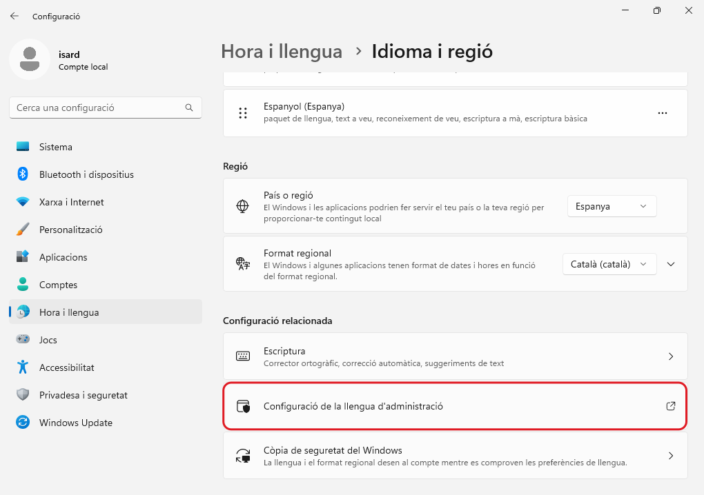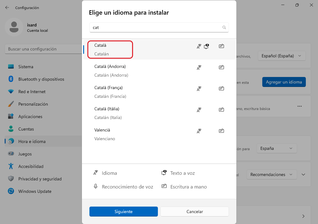 A Configuración → Hora e idioma → Idioma s'afegeix l'Idioma preferido Català (es tanca la sessió si ho demana)
