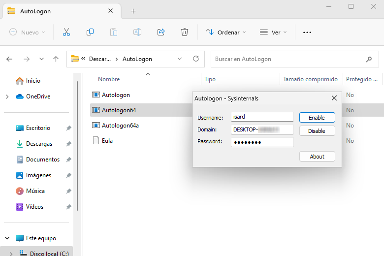 Per a habilitar l'inici de sessió automàtic, s'instal·la l'Autologon.