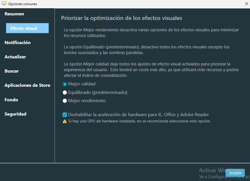 Verificar opcions de rendiment del sistema