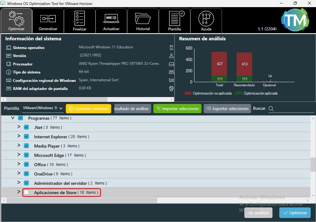 - Microsoft Store : Si en el punt 1 de la desinstal·lació d'aplicacions no s'ha esborrat la Microsoft Store, s'ha de desmarcar la casella d'"Aplicaciones de Store".