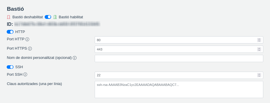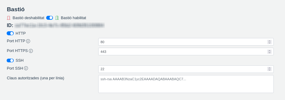 Per poder accedir, cal afegir la clau pública del dispositiu des del qual es vol connectar a l’apartat de claus autoritzades a l’edició de Bastió.
