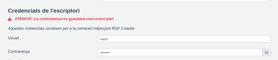 Continuant dins de l’apartat d’edició de la màquina virtual, a la secció Credencials de l’escriptori, es troben les credencials necessàries per accedir remotament a l’escriptori virtual a través del servei SSH. Aquestes credencials serveixen tant per a la connexió per RDP com per a Bastió.