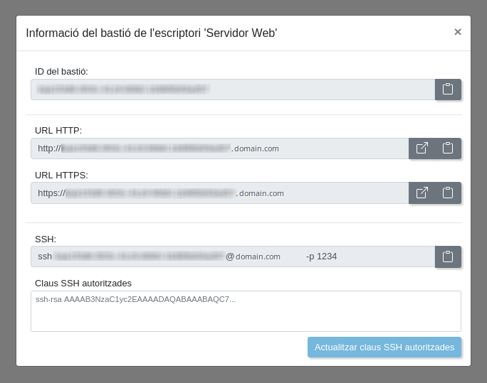 - Nom de domini personalitzat: Aquesta opció permet assignar un nom propi al servidor web (a l’escriptori virtual) en lloc d’utilitzar el UUID de l’escriptori com a domini.