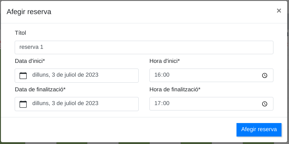 o mitjançant el cursor, clicant en la franja Reserves i arrossegant per a seleccionar el rang d'hora desitjat. En el formulari que apareixerà s'ajusten el rang de dates i hores de durada de la reserva que volem realitzar.