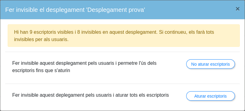 No aturis els escriptoris: Aquesta opció farà que el desplegament sigui invisible per a l'usuari. No obstant això, si un usuari està utilitzant actualment el seu escriptori en el moment en què es fa invisible, encara podran utilitzar-lo fins que decideixin aturar-lo. Un cop aturat, l'usuari no podrà accedir-hi de nou fins que el desplegament es torni a fer visible.