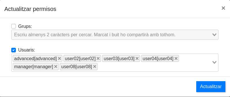 I sortirà una finestra on es podran assignar els grups i/o usuaris.