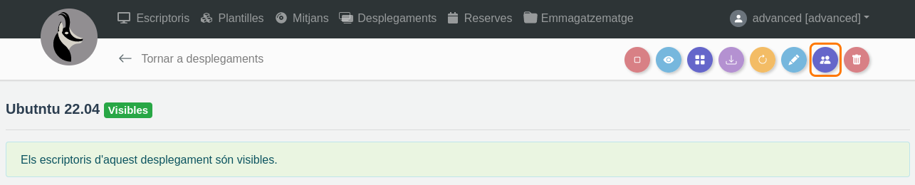 Per a caviar la visibilitat de cada escriptori d'un desplegament, s'ha de seguir la mateixa funcionalitat que la visibilitat de les plantilles, fent ús de la mateixa icona