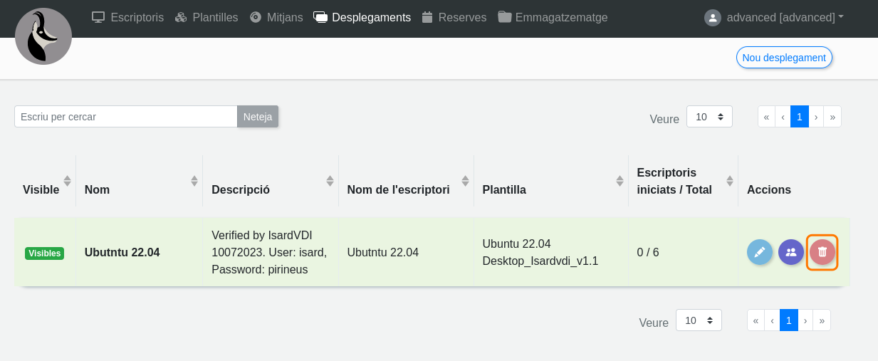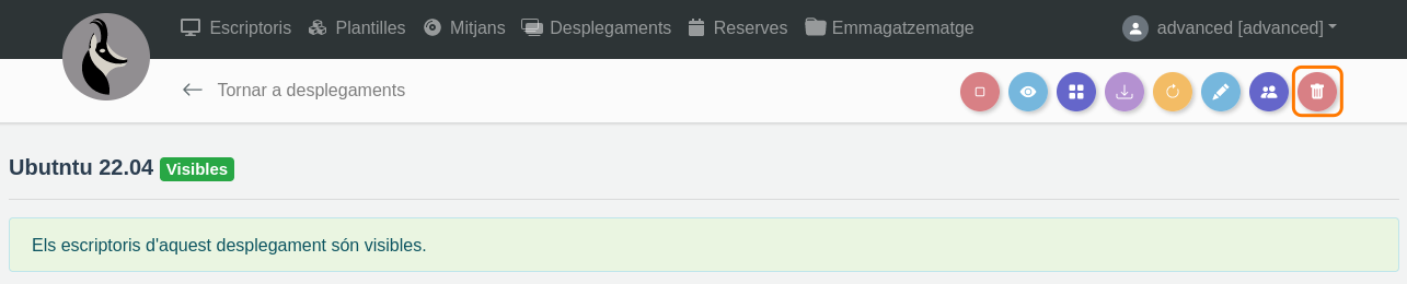 Per a esborrar un desplegament, es pot fer de dues maneres prement la icona