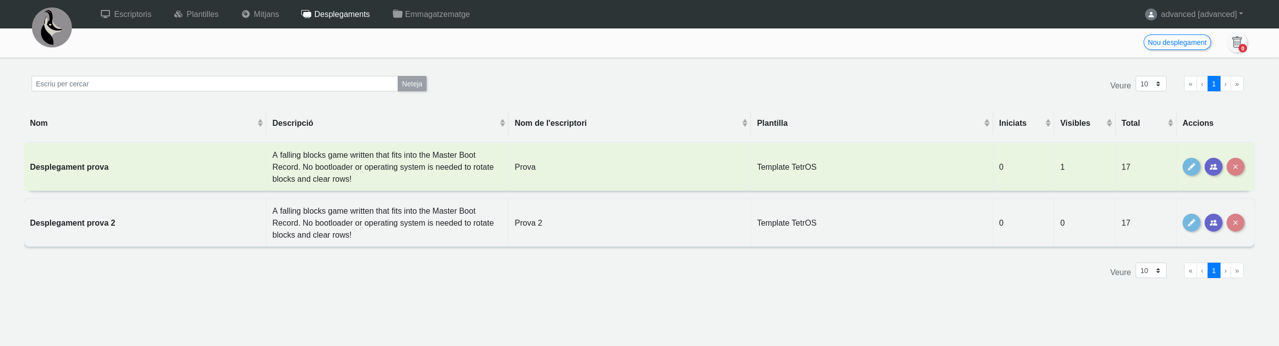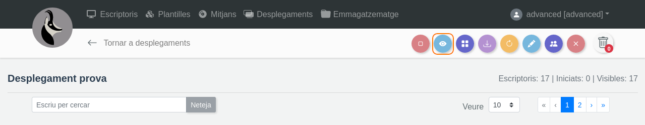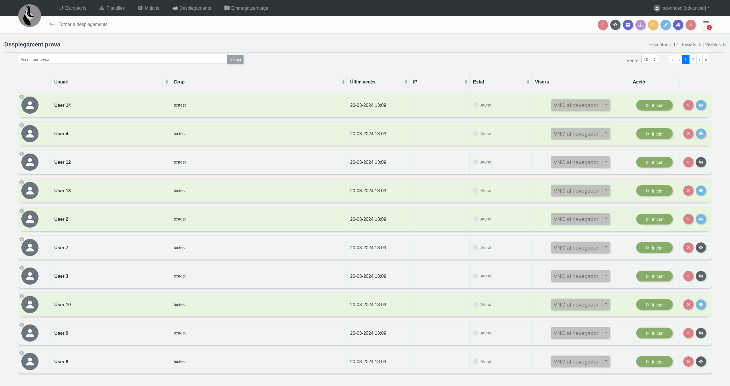 El desplegament mostrarà el seu estat en verd si és visible, i a dalt a la dreta es podrà veure el total d'escriptoris i els escriptoris iniciats i visibles: