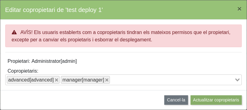 Els usuaris establerts com a copropietaris tindran els mateixos permisos que el propietari del desplegament. Podran iniciar i aturar escriptoris, veure els escriptoris i accedir a la configuració del desplegament. No podran esborrar el desplegament ni canviar el propietari i els copropietaris.
