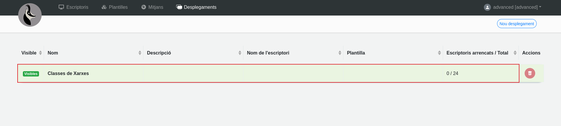 En la vista de desplegaments, si un desplegament té algun escriptori visible, sortirà en verd: