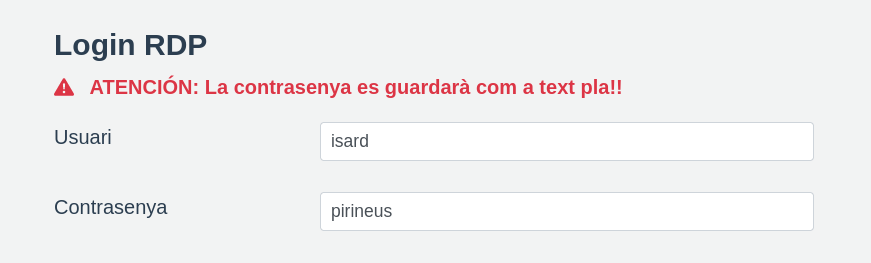 En aquest apartat s'assigna l'usuari i contrasenya de login per als visors RDP (usuari creat al S.O. de l'escriptori). Aquesta configuració només és necessària si no es vol estar identificant-se en l'escriptori per RDP tota l'estona i si el visor RDP està seleccionat.