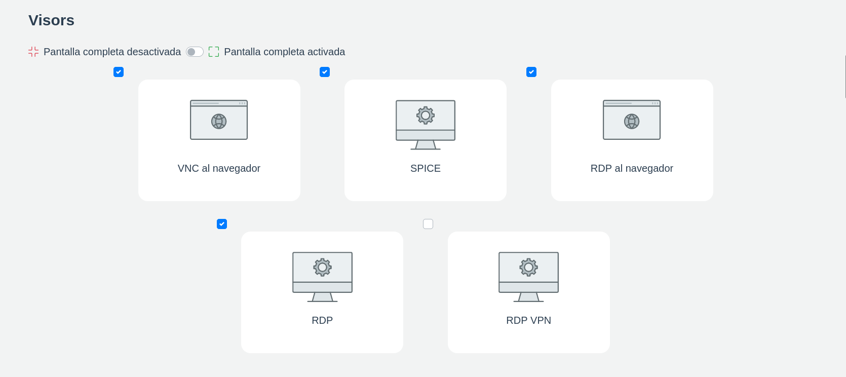 En aquest apartat es poden seleccionar quins visors es volen utilitzar per accedir a l'escriptori. També es pot seleccionar si es vol iniciar l'escriptori en pantalla completa o no.