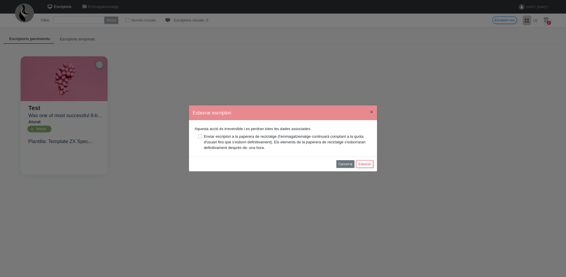 Per defecte, en esborrar un escriptori aquest s'eliminarà de manera definitiva, però s'oferirà a l'usuari la possibilitat de enviar l'escriptori a la paperera de reciclatge mitjançant una casella de selecció. A més, s'indicarà a l'usuari el temps màxim que pot estar l'escriptori a la paperera de reciclatge.