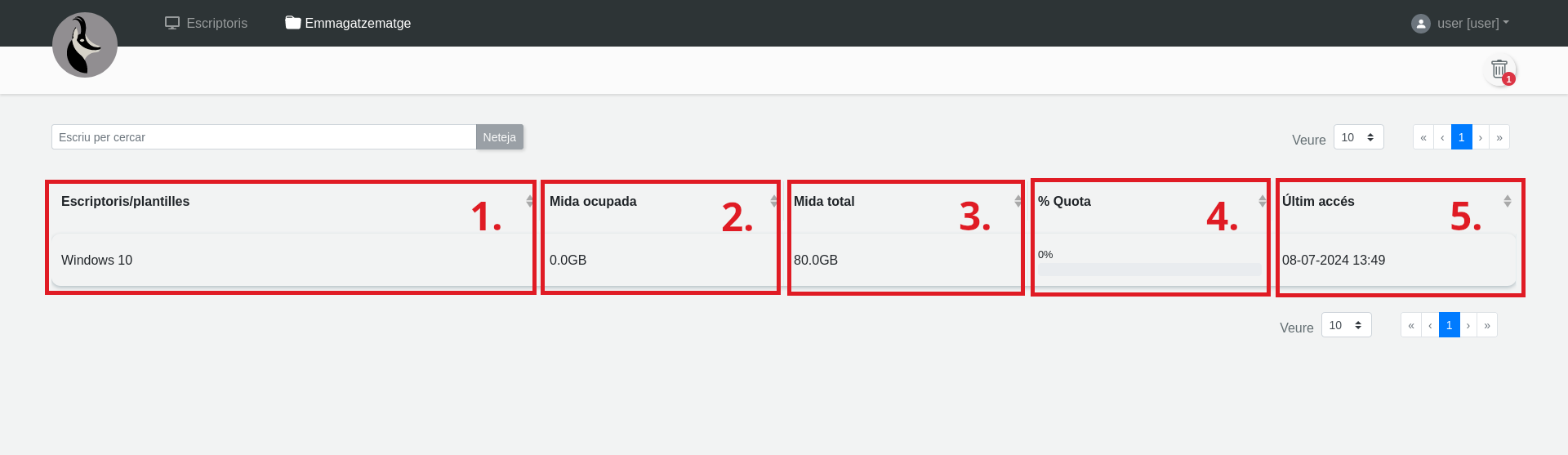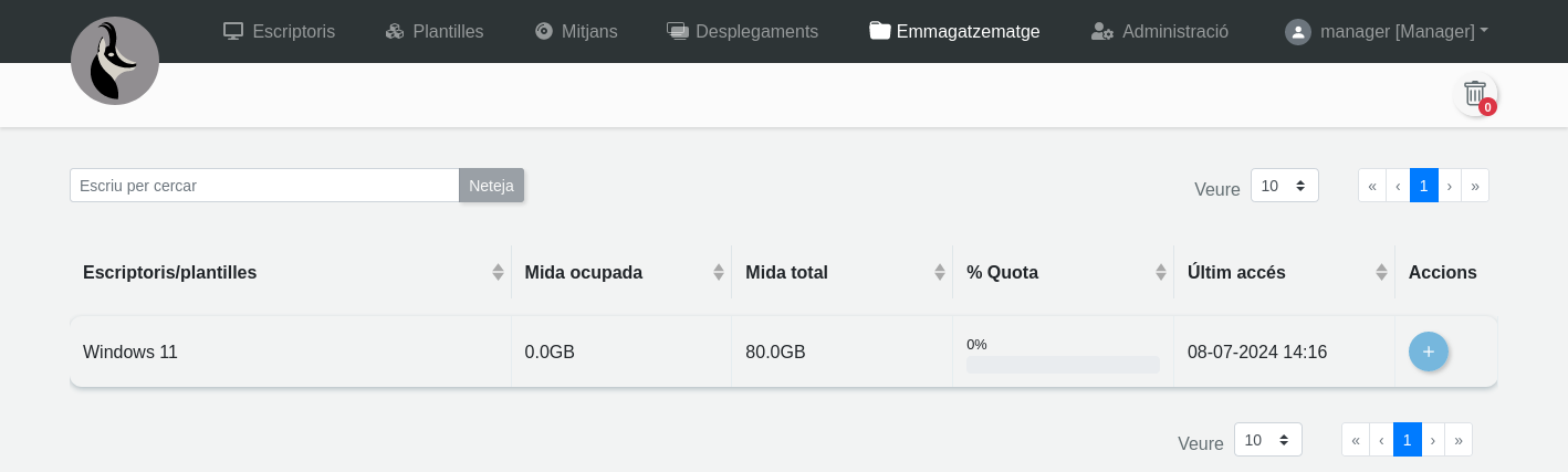 Des de la vista principal de l'usuari, a Emmagatzematge es pot obtenir més d'informació sobre els discs dels escriptoris que s'han creat, així com el consum d'aquests i de plantilles.