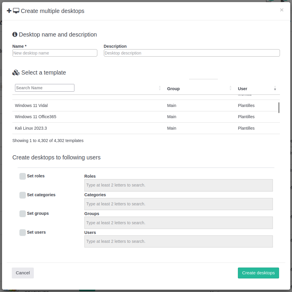 Este formulario permite crear varios escritorios simultáneamente. Para crearlos, simplemente se tiene que rellenar el formulario especificando un nombre para los escritorios nuevos y seleccionando la plantilla sobre la que se basarán.