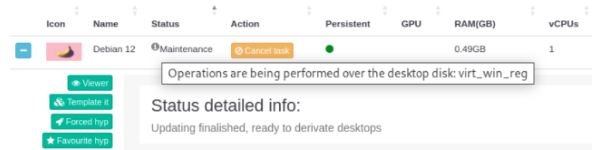 En algunos casos, el proceso de mantenimiento puede tardar más de lo esperado, posiblemente debido a un proceso atascado. Si esto ocurre, los usuarios pueden hacer clic en el botón "Cancel operation". Esta acción cancela la tarea en curso y debería devolver el escritorio a un estado en el que se pueda iniciar, cambiando su estado de "Failed" a "StartedPaused" a, si no ha habido ningún problema, "Stopped".