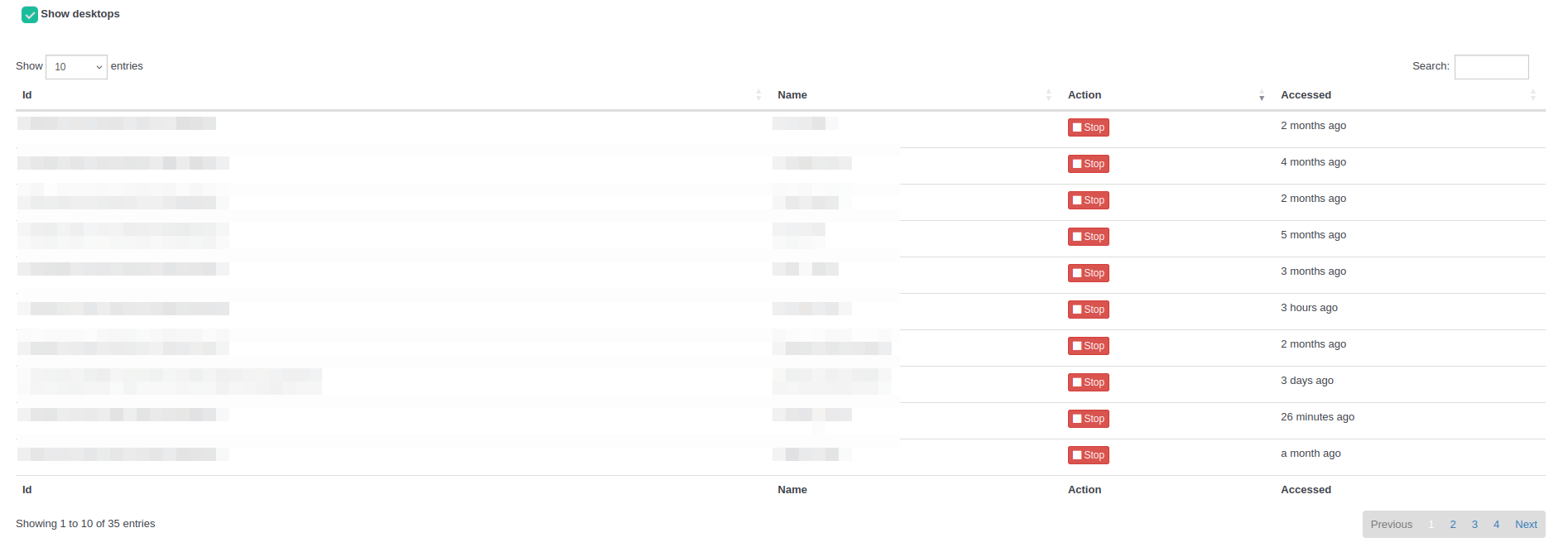 Aquí podremos ver el ID del escritorio (cada escritorio tiene un ID propio y único que lo identifica del resto), el nombre del escritorio, las acciones individuales que se pueden realizar sobre ese escritorio y la fecha del último acceso o arranque.