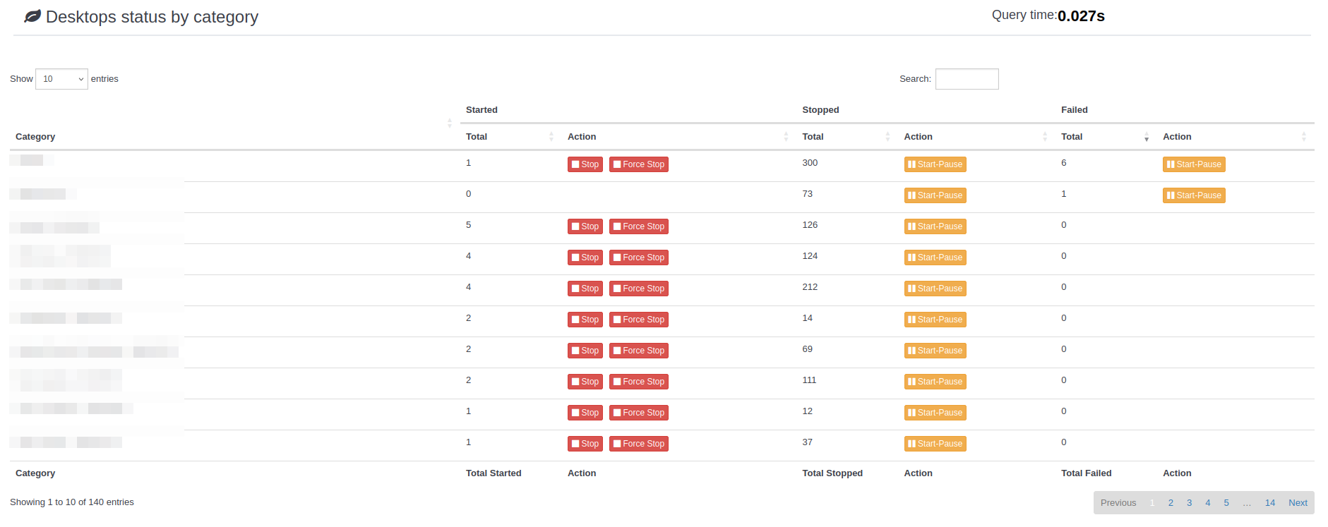 Desktop status by category: En este apartado se visualizan los escritorios creados por categoría, distribuidos según su estado: Started (en ejecución), Stopped (detenidos) y Failed (con fallos). Donde se podrán realizar diferentes acciones.