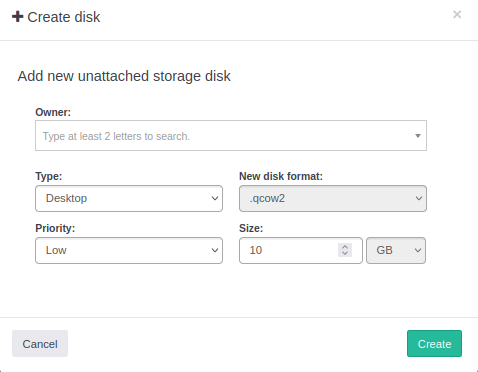 - Type: El tipo de elemento para el que se crea el disco. Puede ser Desktop (escritorio virtual), Media (medio), Template (plantilla), o Volatile (escritorio temporal/volátil).