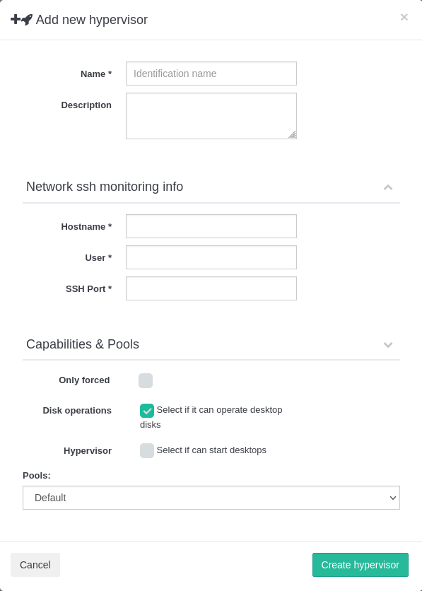 Cuando se edita o se crea un hipervisor, se puede verificar si será solo un hipervisor. En este modo, ese servidor solo será utilizado por IsardVDI para ejecutar escritorios virtuales. Este servidor no manejará operaciones de discos virtuales.
